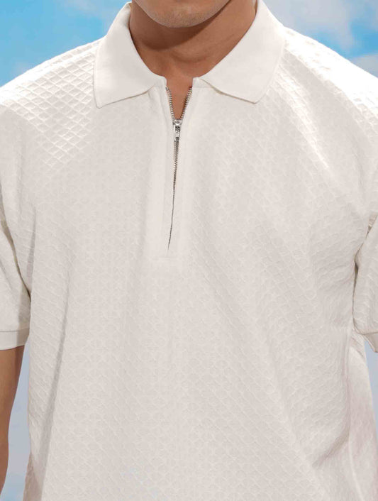 Cream Solid Texture Waffle Fabric Semi Drop T-shirt