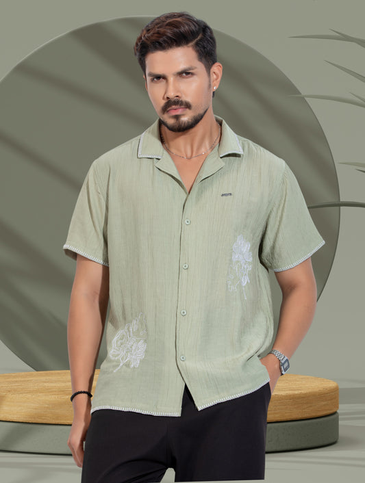 White Olive Leaf Printed Pocket Contrast Drop Shoulder Shirt