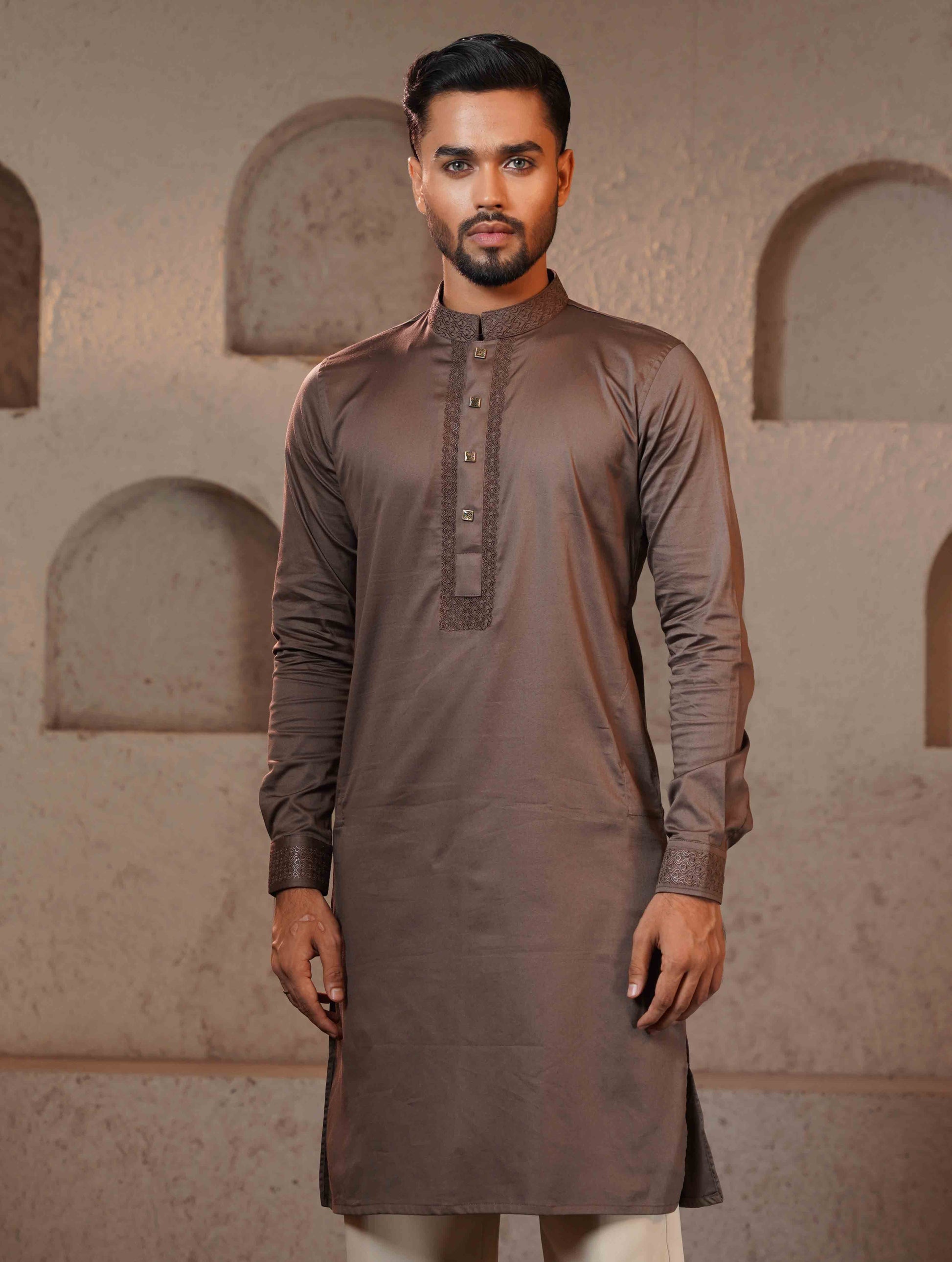 Dark Coffee Collar and Cuff Embroidery design Premium Panjabi